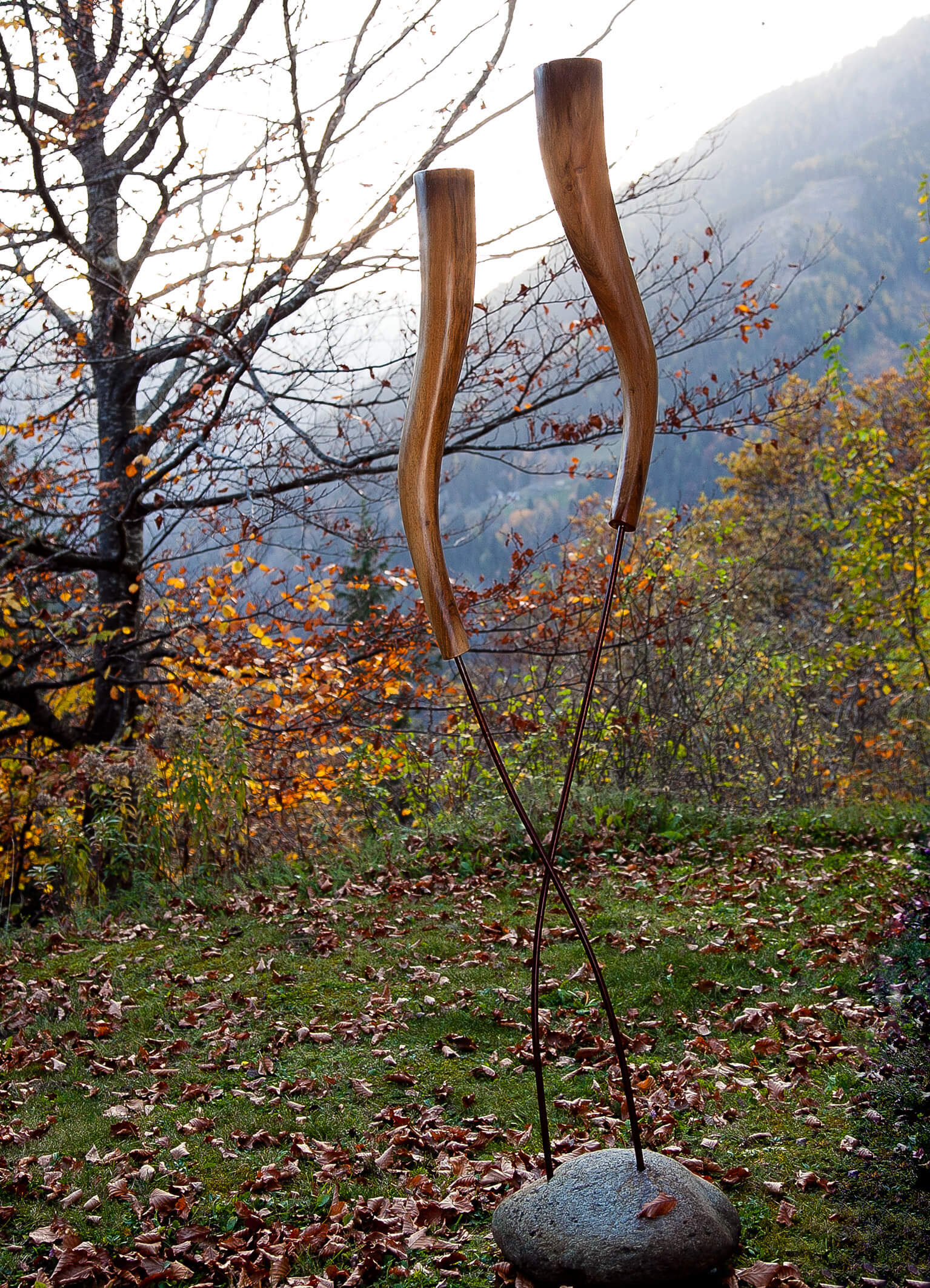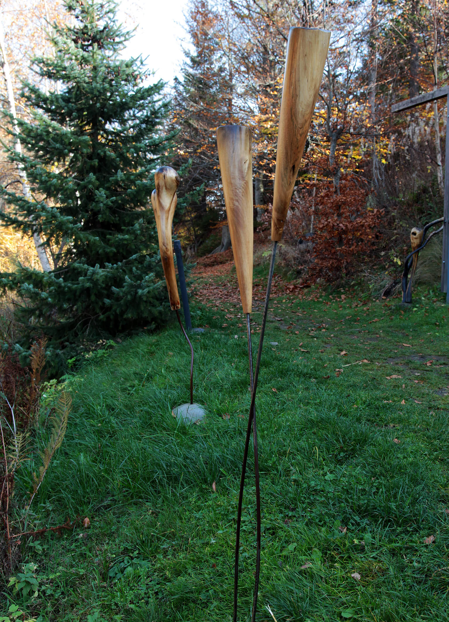 Die Holzskulpturen sind ausschließlich aus heimischen Hölzern gefertigt. Die Formen der Skulpturen ergeben sich oftmals durch den Wuchs des Baumes und heben somit die Schönheit der Holzmaserung hervor. Durch mehrfaches Ölen glänzt die feinst geschliffene Oberfläche und die Tiefe der unterschiedlichen Farbtöne der Hölzer kommt wunderbar zur Geltung. Dadurch sind sie auch witterungsbeständig und somit für den Außenbereich geeignet. Der Großteil der Skulpturen sind Feuerblumen. Das bedeutet, sie haben eine Vertiefung, in die man eine Ölfackel geben kann. Somit sind sie nicht nur am Tag dekorativ und schön anzusehen, sondern sie strahlen auch in der Nacht und verbreiten eine stimmungsvolle Atmosphäre.